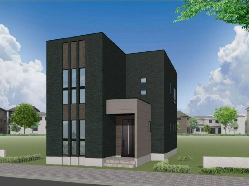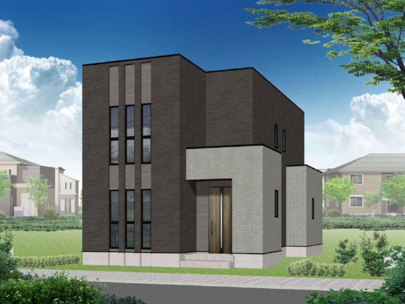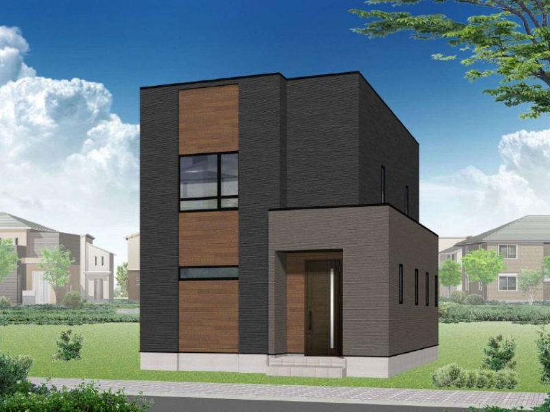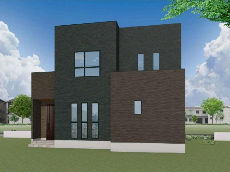 【1号地 完成イメージ】ダークカラーを基調としており、都会的なボックス型デザイン。長い将来家族に愛される、飽きのこない外観です。植栽が映えるカラーなので、お庭でガーデニングなどもお楽しみいただけます。