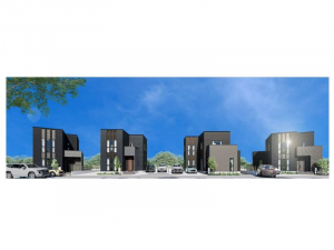 【街並み完成イメージ】右側から1号地、2階建て4棟が並び外観を黒ベースでまとめたスタイリッシュな街並みです。3・4号地には太陽光発電システムを搭載!