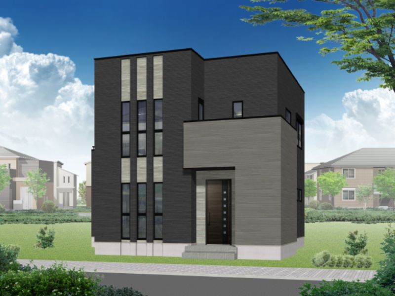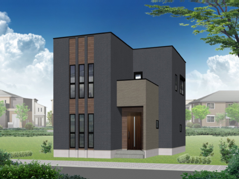 【3号地 完成イメージ】太陽光発電3.56kwを搭載したオール電化住宅!南向きのリビングには、暖かな陽射しが差し込みます。人気のネイビーカラーと木目調の外壁が都会的な外観デザインです。