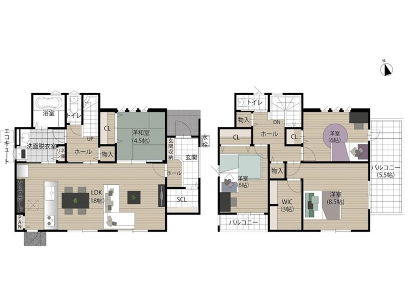 【4号棟】2Wayバルコニーを設置することで、2階の洋室に開放感を感じられます!玄関のスペースはゆったり広め。シューズクロークも安心の収納力。洗濯脱衣室にはリネン庫があるので、家事動線が短縮できます。