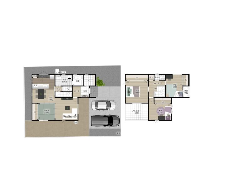 【2号地】南西面に6.0帖のワイドバルコニーを設置♪お洗濯はもちろん、カフェテラスやペットとの遊び場としてなど多目的な使い方が楽しめるのも魅力的。吹き抜けから柔らかな陽光が届く、心地の良い住まいです。