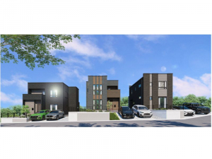 【全7棟】今回販売区画7区画。充実の環境と設備を備えた新築戸建分譲住宅。全区画駐車スペース3台以上可能。右から3号地、4号地、5号地の完成イメージパースです。