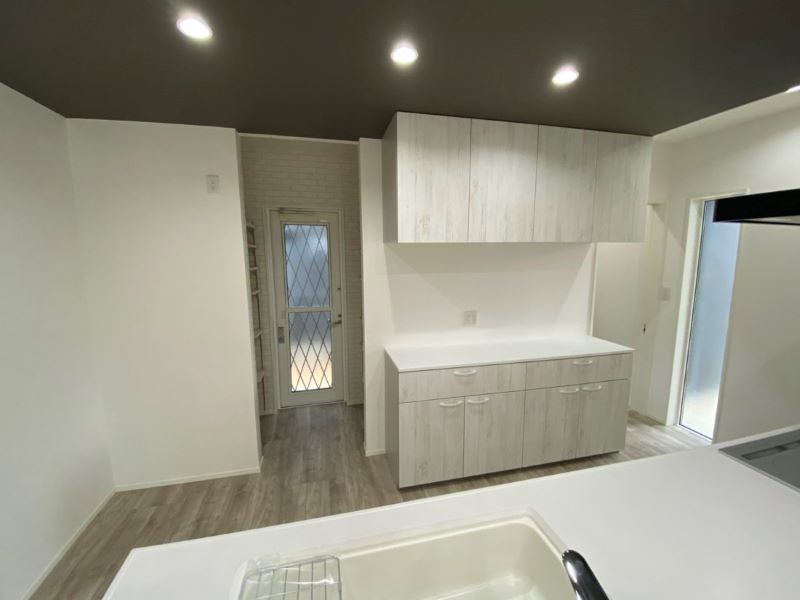 【カップボード】幅1,800カップボードは収納力抜群!カウンターも広く、電子レンジや炊飯器などの家電も置けます。