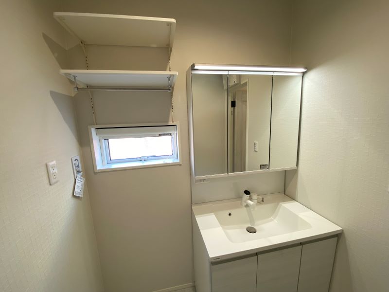 【2号地】ファミリークローゼットと洗面脱衣室を隣接さえ、効率的な生活・家事動線を確保しました。お洗濯後に家族みんなの衣類をすっきり1ヶ所にまとめられます。身支度・帰宅後のスムーズな動線を確保。