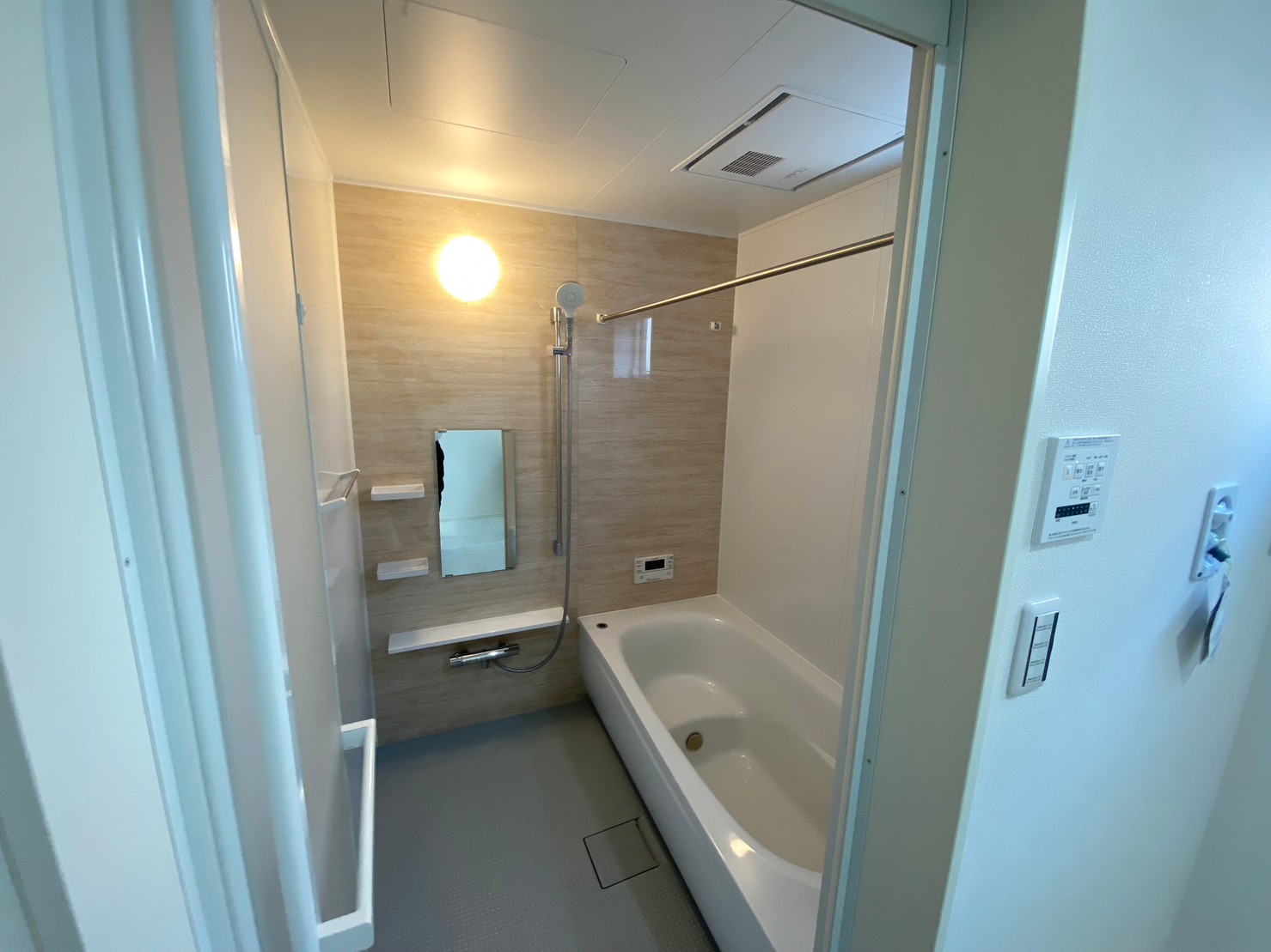【システムバスルーム】浴室はTOTO カラリ床(水が引いて翌朝カラリ)魔法びん浴槽は優れた断熱構造。浴室暖房乾燥機も標準装備。