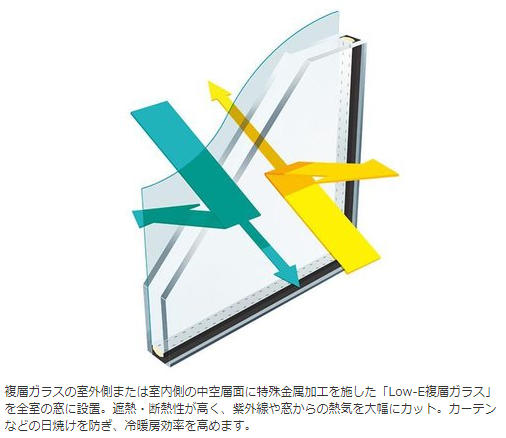 複層ガラスの室外側または室内側の中空層面に特殊金属加工を施した「Low-E複層ガラス」を全室の窓に設置。遮熱・断熱性が高く、紫外線や窓からの熱気を大幅にカット。