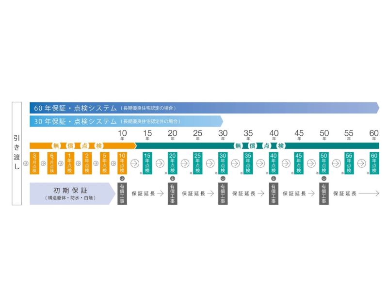 当社並びに当社指定業者が実施する定期的な点検と有償のメンテナンス工事を継続していただくことで、10年毎の延長保証を継続でき、最長30年間の保証をいたします。