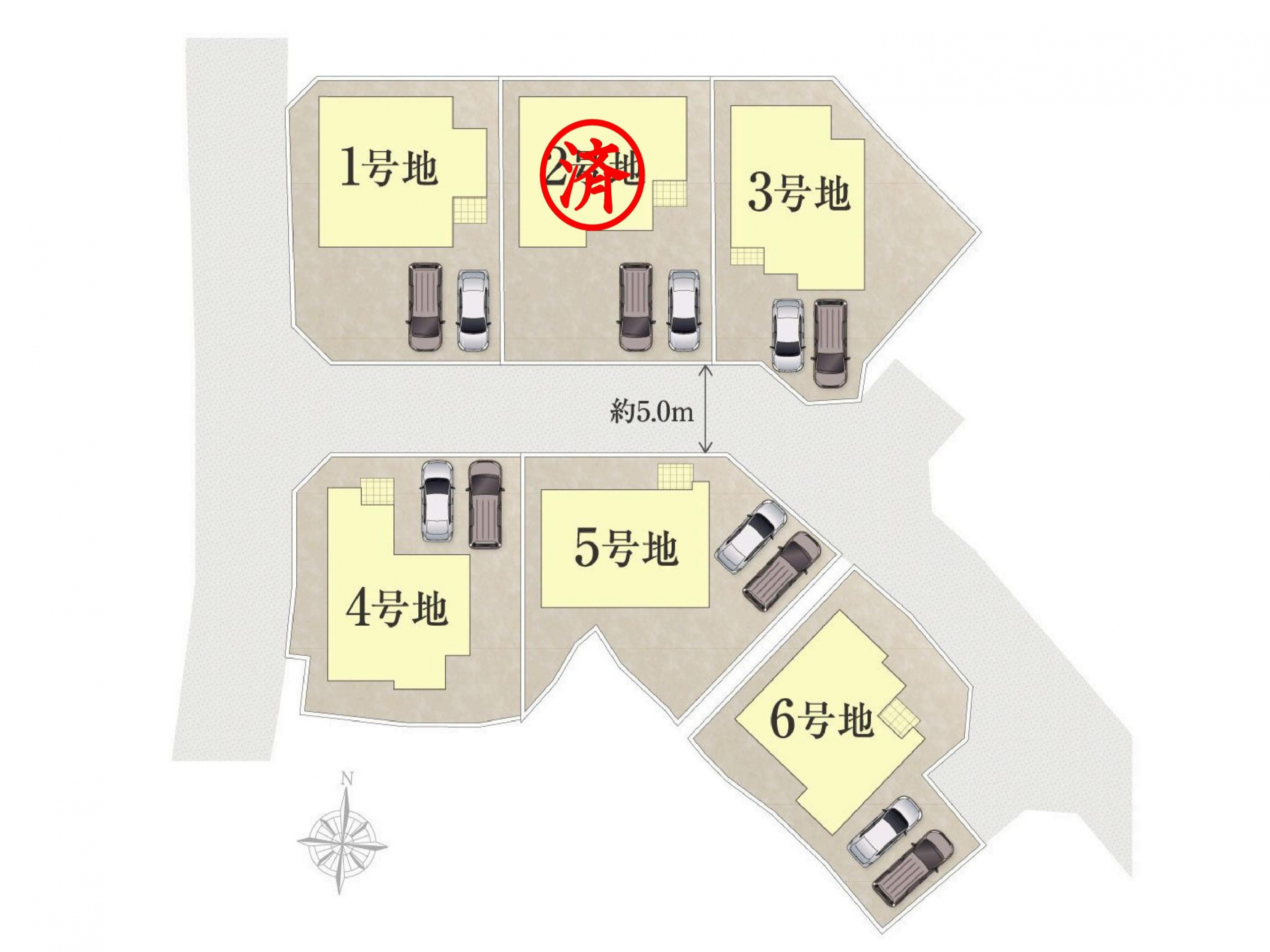 【区画図】全5棟販売中!!駐車スペースは2、3台可能です。