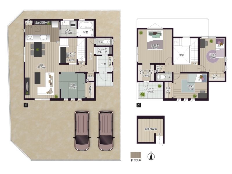 【1号地/広々スキップフロア、基礎内収納のある間取り】敷地面積:174.21㎡(52.69坪)/延床面積:115.92㎡(35.06坪)/間取り:4LDK(2階建て)