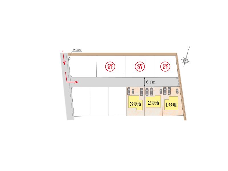 分譲地内の道路は幅員6.1mと広めに確保されていて、お車の出し入れもスムーズに行えます。車の通り抜けができない区画設計なので、小さなお子さまがいるご家庭にも安心の住環境です。