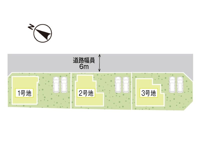全邸南面LDK♪隣家との間隔が大きく、採光・通風をしっかりと確保したプラン設計です。カースペースは3台完備。前面道路幅は約6.0mとお車の出し入れや駐車もスムーズに行えます。