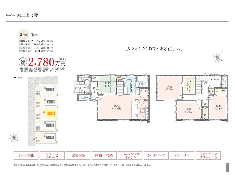 ※価格は物件の代金総額を表示しており、消費税が課金される場合は税込み価格です。※外観画像・内観画像・CGパース・間取り図に描かれている車両・家具・調度品等は販売価格には含まれません。※完成予想図はいずれも外構・植栽・外観等実際のものと多少異なる場合があります。※販売戸数が複数の物件につきましては、物件の特徴がすべての住戸に該当しない場合があります。※所要時間は、徒歩:道路距離80m/1分間、自転車:道路距離250m/1分間、自動車:道路距離666m/1分間を要するものとして算出した数値となります。