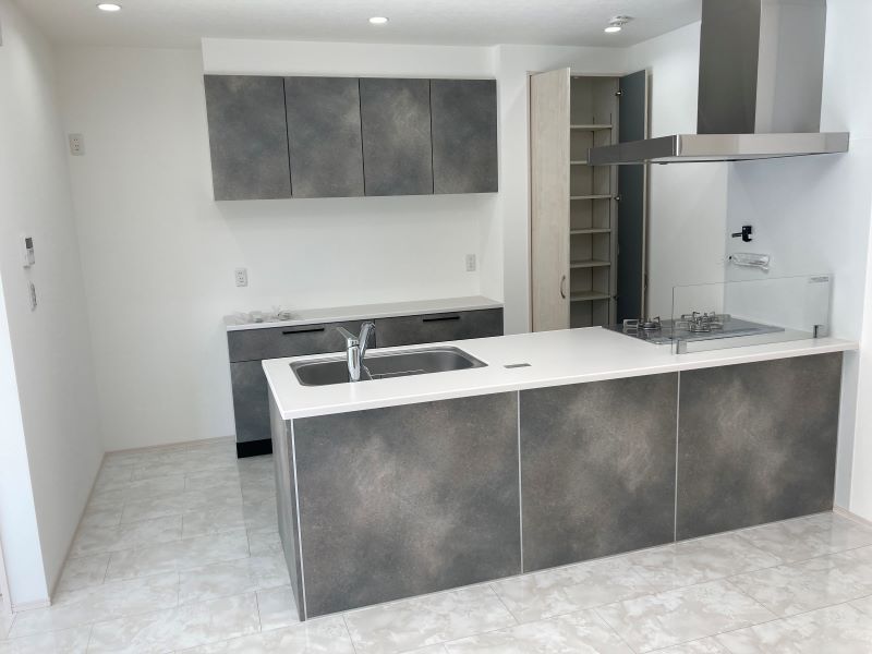据え付け型の食器収納で地震の時にも倒れて来ないため安心。豊富な収納量で食器などもたくさん収納できます。