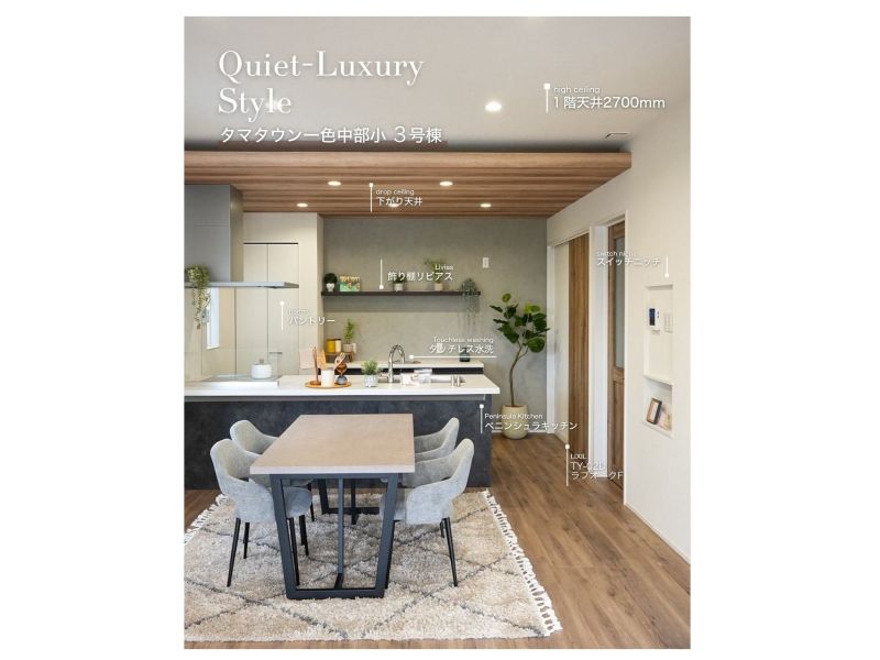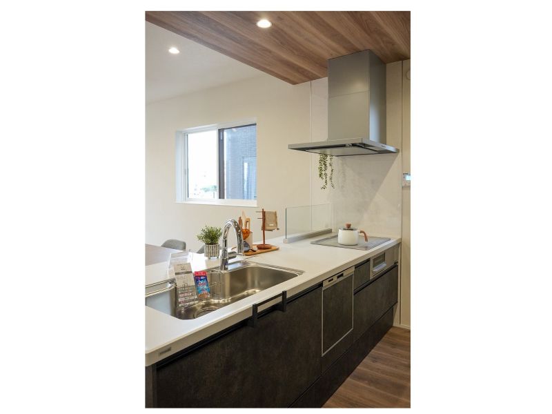 3号棟 ■下がり天井が印象的なキッチン ■ペニンシュラキッチンを採用 ■開放感のある明るいキッチンで、家族との会話も弾みます (※家具はイメージです)