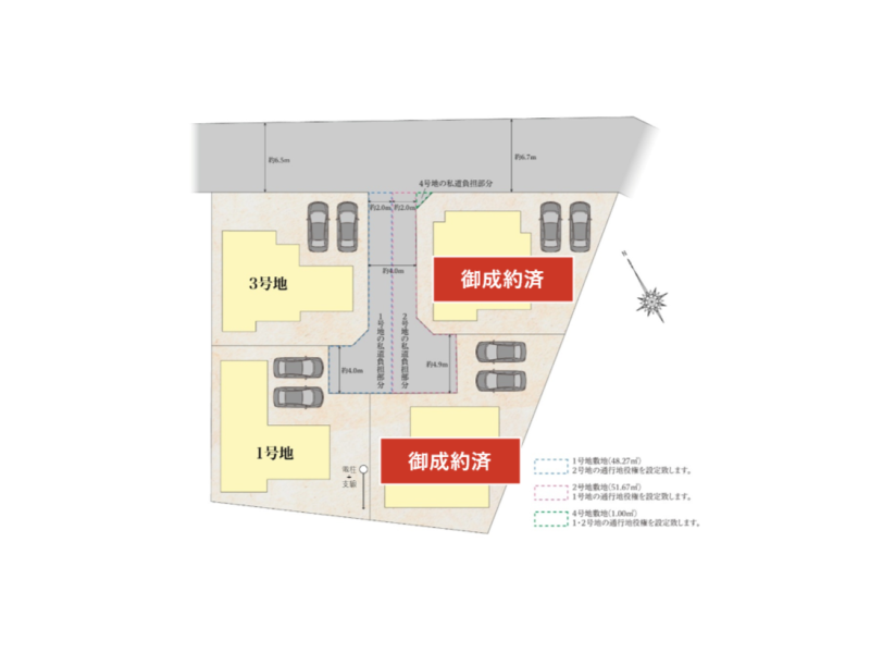 | 私道負担・道路 | 私道負担:有(1号地)・ 道路:幅員約6.7m |