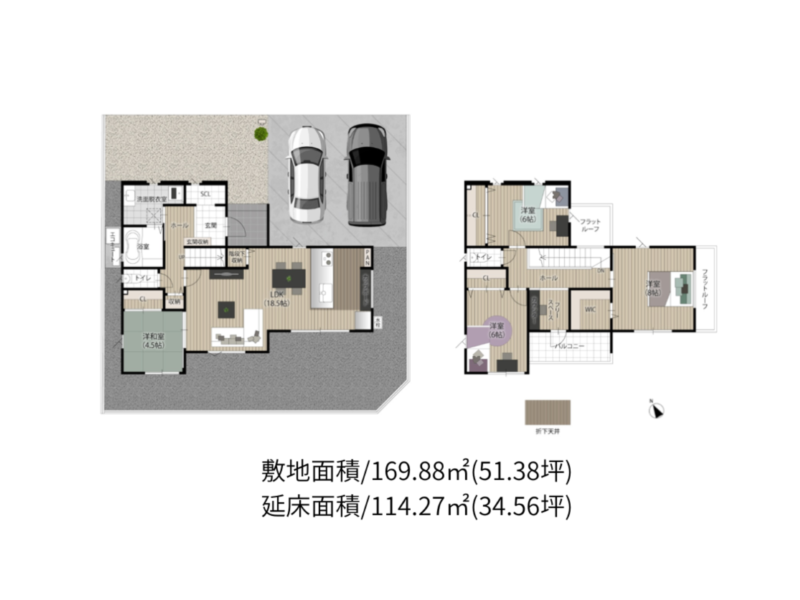 【3号地 間取り】■敷地面積/169.88㎡(51.38坪)■延床面積/114.27㎡(34.56坪)●1階面積/60.45㎡●2階面積/53.82㎡