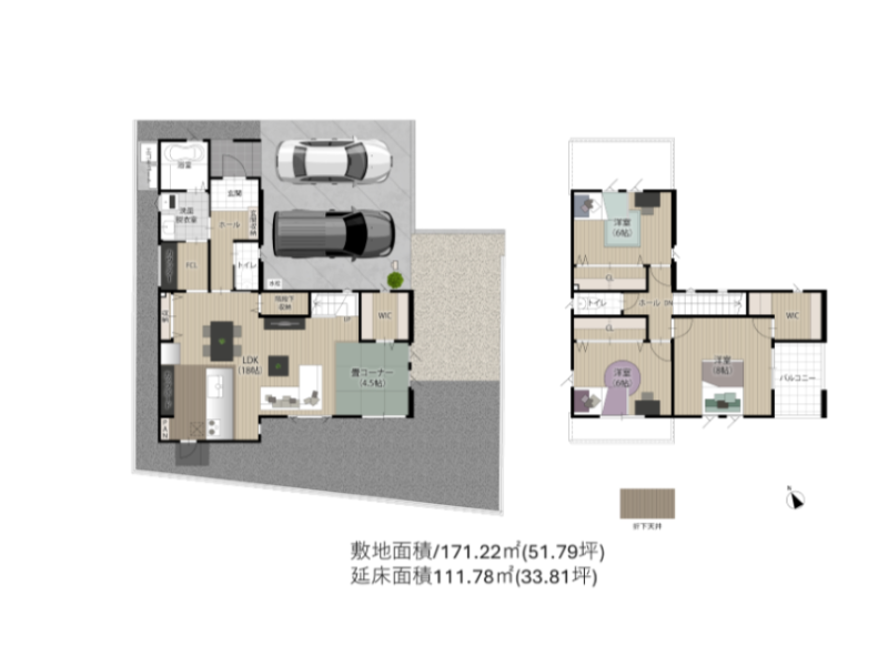 【1号地 間取り】敷地面積:171.22㎡(51.79坪)/延床面積:111.78㎡(33.81坪)/1階面積:62.10㎡(18.78坪)/2階面積:49.68㎡(15.02坪)