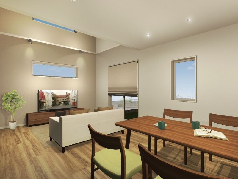 【2号地 内観パース】たっぷり光が入り込む、開放感あるLDKです。