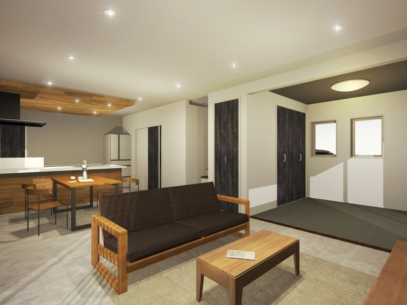 【3号地 内観パース】LDKとつながる和室スペース。お子様の遊び場やちょっとしたくつろぎ空間としても便利にお使いいただけます。