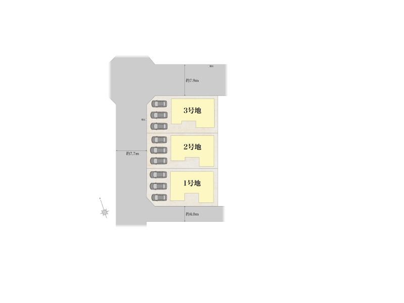 【区画図】前面道路7.7mとかなり広く駐車が苦手な方でも楽々駐車可能。スーパー・ドラッグストア徒歩圏内で快適な生活環境。