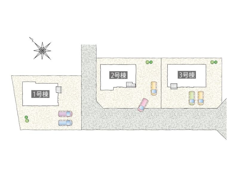 | 私道負担・道路 | 有(1号地:256.10㎡→1/5、82.60㎡→1/3、2・3号地:256.10㎡→1/5) |