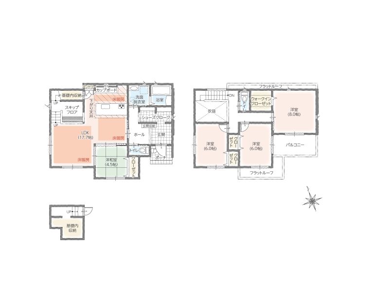 【2号棟 間取り】スキップフロアや基礎内収納を採り入れた設計が、空間にゆとりと広がりを生み出します。シューズクロークや宅配ボックスも備え、快適で上質な日常を支えます。