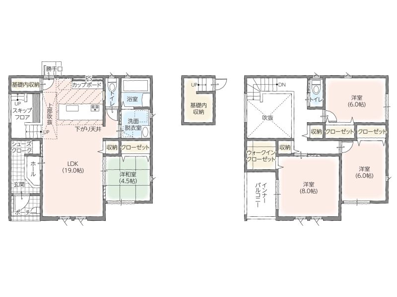 スキップフロアや基礎内収納を採り入れた設計が、空間にゆとりと広がりを生み出します。シューズクロークや宅配ボックスも備え、快適で上質な日常を支えます。