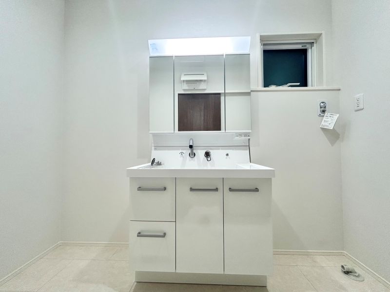 【洗面台】使いやすくお手入もラクなデザインの間口900mmのカウンター。3面鏡はヒーターレスのくもりシャット付き、扉内部にコンセントがあるのでシェーバーや電動歯ブラシも充電しながら収納可能です。