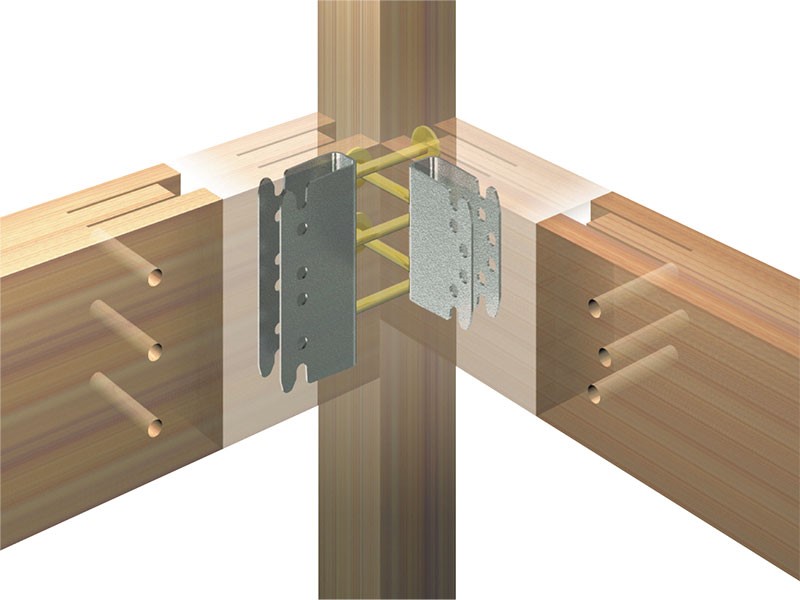 しっかりと軸組を固定する通し柱接合金物。通柱の削り取り部分を最小限に抑えることで柱の断面欠損が小さくなり、梁仕口のせん断面強度が大きくなります。