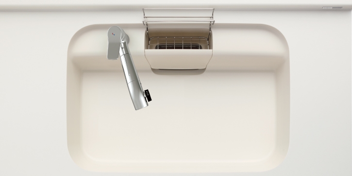 調理中の野菜洗いや、皿洗い時の水の力でシンクの中のゴミを排水口に向けて流してくれる新機能シンクです。
