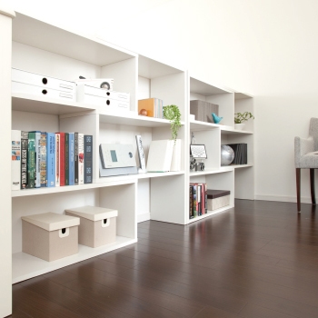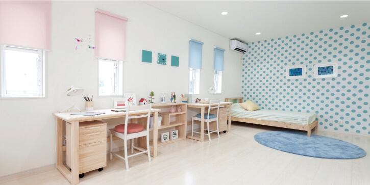 こどもたちの成長に合わせて、部屋を簡単に2つに分けられる間仕切り代わりの可動式収納をつけることもできます。