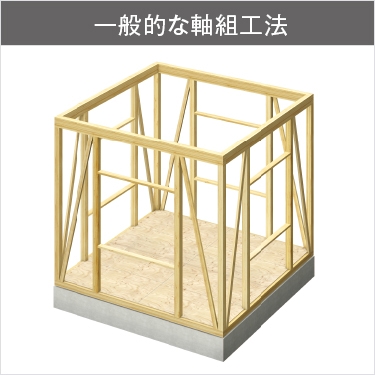 - 柱や梁に筋交を入れる一般的な軸組工法。「点と線」で支えるため、強い外力の場合荷重が接合部に集中しやすい。