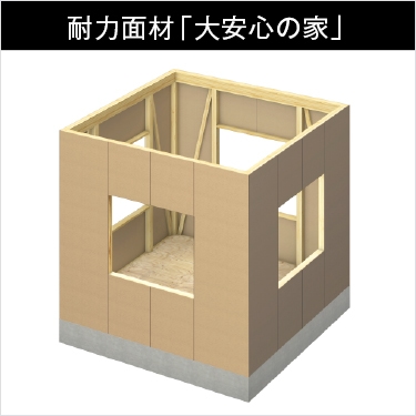 筋交をバランスよく配置し、接合性能と強度の高い構造用耐力面材を土台や柱、梁へ直接張ることにより、地震や暴風に対する強度がアップ。四方を囲む耐力面材によって、外部からの力を建物全体へ分散させ、高い耐震性を確保します。