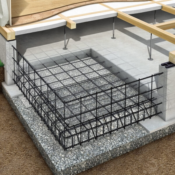 強い家づくりにこだわるタマホームは、建物を底面全体で支えることで不動沈下を起こしにくいベタ基礎を標準採用。コンクリートは計画共用期間が約65年(JASS5基準)の高い耐久性と強度を確保し、鉄筋は、徹底した品質管理が行われる工場で溶接・加工されてユニット鉄筋を採用しています。建物をしっかり支え、強い地震の揺れにも耐える強固な家づくりを実現しています。