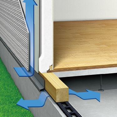外壁材と構造躯体の間に外気が流れる通気層を作ることによって、湿気を外部に放出。壁内の通気層は屋根裏まで通っており、結露や湿気を少なくすることで、構造体や断熱材を腐食やカビから守ります。また、基礎パッキンを採用し、床下のすみずみまで風を行きわたらせることにより、シロアリの発生を未然に防ぎ、建物の耐久性を向上させます。