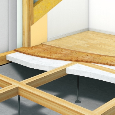1階と2階の床には、剛床工法を採用。24mmの構造用合板を土台や梁に直接留めつけて、床全体を一体化します。一般的な根太工法に比べ、横からの力に対する強度が2倍になり、地震の横揺れにも効果を発揮します。また、2階の床には厚さ12.5mmの硬質石膏ボードを敷き詰めて防音対策を施しています。