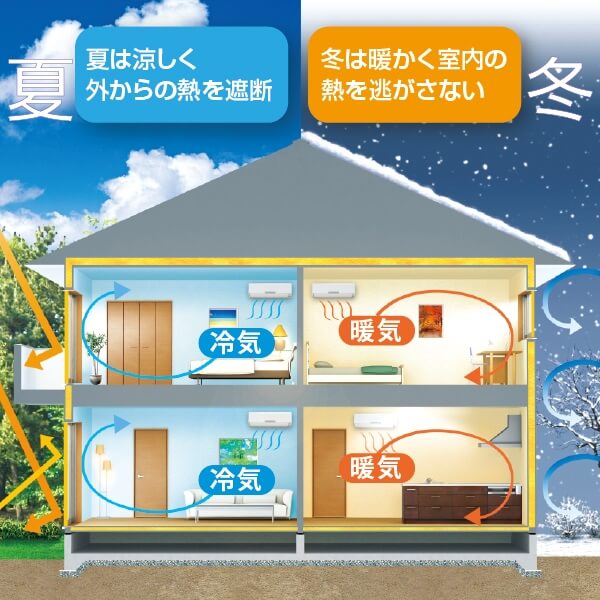 断熱等性能等級は、住宅にかかるエネルギーを抑えるために定められた断熱や省エネに関する基準です。「大安心の家 [暖]」は、壁と天井にグラスウール、床にポリスチレンフォームの断熱材を施工。地域に対応した断熱材を使用し、断熱等性能等級【等級5】をクリアした高い断熱性と気密性を確保しました。