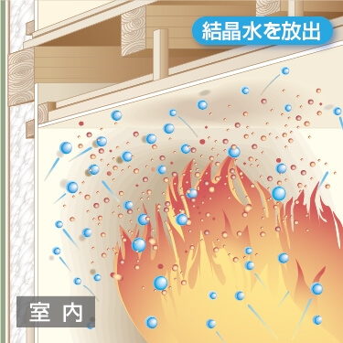 壁や天井の下地に、石膏ボードを使用。ボードの内部には約21%の結晶水が含まれており、万一の火災時には、熱分解の反応によって約20分間にわたり水蒸気を発散し、温度上昇を抑制します。不燃性の石膏ボードを各居室に使用することで、耐火性とともに火災時の延焼防止効果を向上させています。
