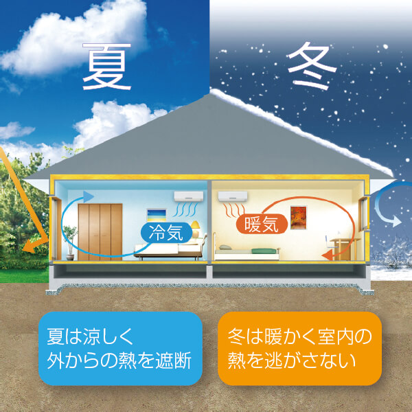 外壁材と構造躯体の間に外気が流れる通気層を作ることによって、湿気を外部に放出。壁内の通気層は屋根裏まで通っており、結露や湿気を少なくすることで、構造体や断熱材を腐食やカビから守ります。また、基礎パッキンを採用し、床下のすみずみまで風を行きわたらせることにより、シロアリの発生を未然に防ぎ、建物の耐久性を向上させます。