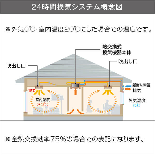 ※全熱交換効率75%の場合での表記であり、外気 0℃・室内温度20℃にした場合での温度です。