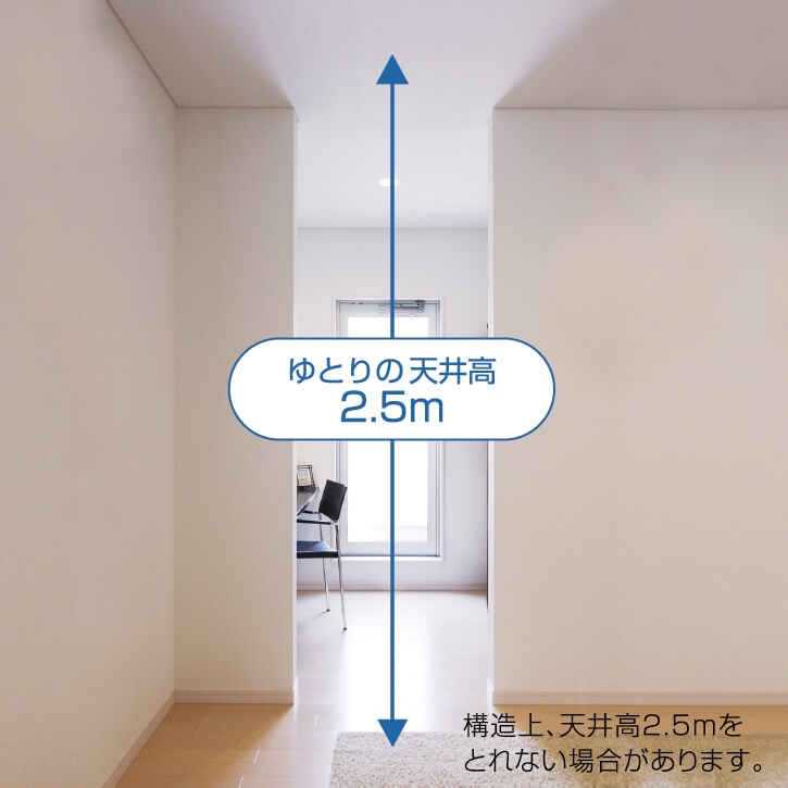 天井高2.5mの高さを確保することで、より開放的でゆったりとした広がりのある空間を 作り出します。