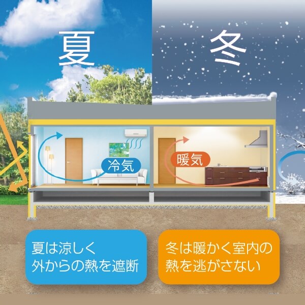 壁・基礎を外側から断熱材で隙間なく覆うことで、高い断熱性・気密性を確保。充填断熱に比べて、床下を含めた家全体の保温効果が高まります。また湿気を通さず、吸水率の低い断熱材を採用することで、壁体内の結露を防ぎます。