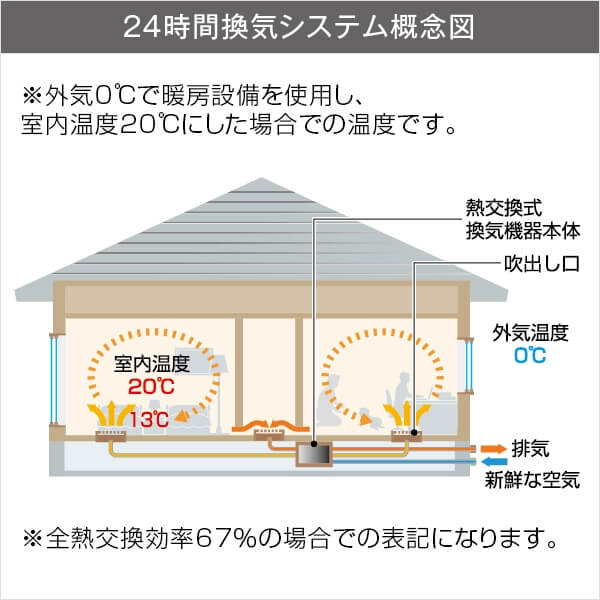 ※全熱交換効率67%の場合での表記であり、外気 0℃・室内温度20℃にした場合での温度です。