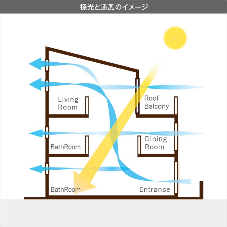 ながく家の資産価値を維持できるだけでなく、税制上の様々な優遇が受けられる長期優良住宅に、「木望の家」は標準で対応しています。認定項目のひとつである「耐震性」については、認定基準として求められている、住宅性能表示制度「等級3」をクリア。数百年に一度発生する地震の1.5倍の力でも倒壊・崩壊しない、高い耐震性を確保しています。家の強さにこだわった頑強な構造躯体で、快適な3階建ての暮らしを守ります。