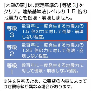 ながく家の資産価値を維持できるだけでなく、税制上の様々な優遇が受けられる長期優良住宅に、「木望の家」は標準で対応しています。認定項目のひとつである「耐震性」については、認定基準として求められている、住宅性能表示制度「等級3」をクリア。数百年に一度発生する地震の1.5倍の力でも倒壊・崩壊しない、高い耐震性を確保しています。家の強さにこだわった頑強な構造躯体で、快適な3階建ての暮らしを守ります。