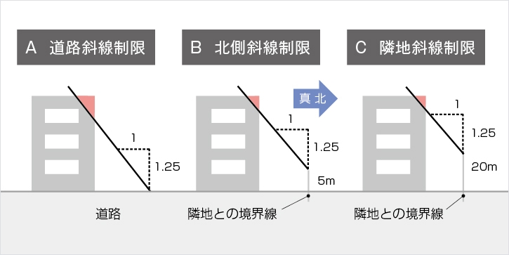- 周囲の日照や風通しを確保するため、A:道路斜線制限、B:隣地斜線制限、C:北側斜線制限があり、定められた斜線内に建物を収める必要があります。
