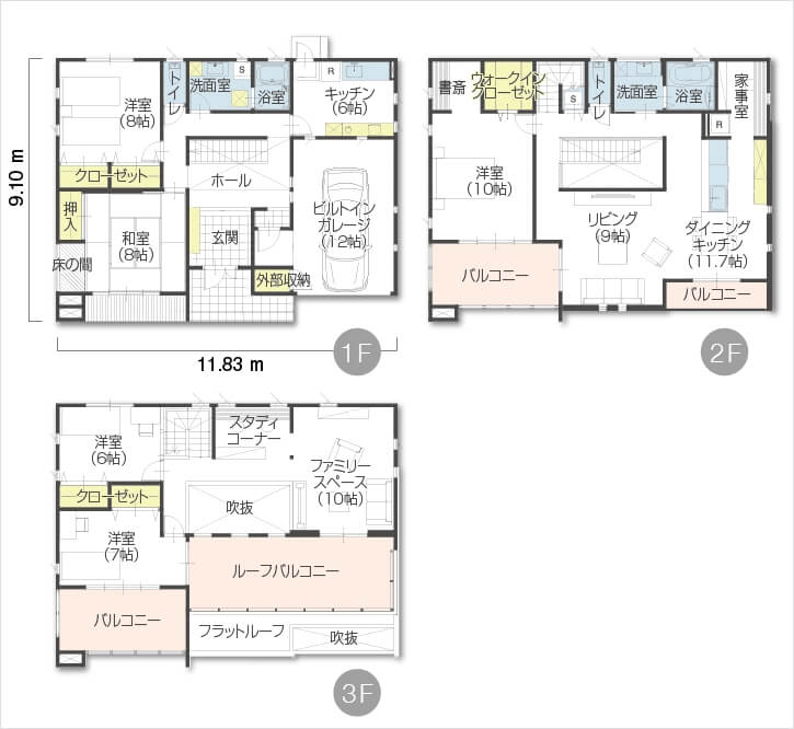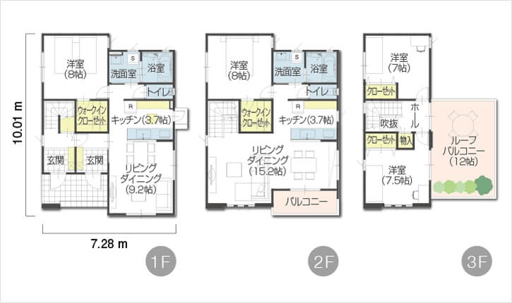 3LDK+1DK+ルーフバルコニー 間口7.28m 奥行10.01m
