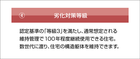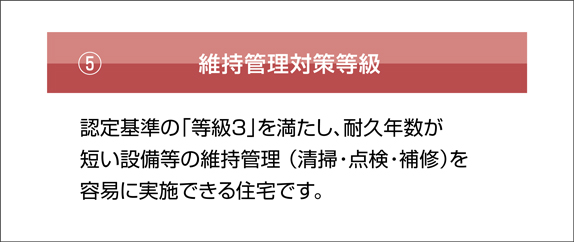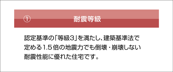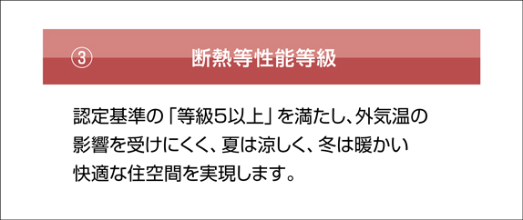 2009年6月に施行され、2022年10月に改訂された法律に基づき、長期優良住宅に求められる5つの性能基準について「木望の家」は、標準仕様においてすべてクリアしています(住宅性能表示制度での等級を適用)。
