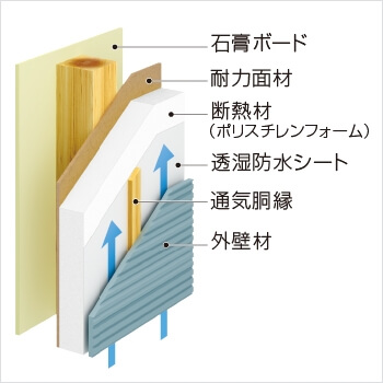 壁・基礎を外側から断熱材で隙間なく覆うことで、高い断熱性・気密性を確保。充填断熱に比べて、床下を含めた家全体の保温効果が高まります。また湿気を通さず、吸水率の低い断熱材を採用することで、壁体内の結露を防ぎます。