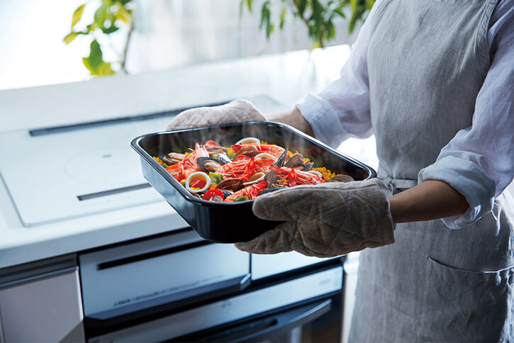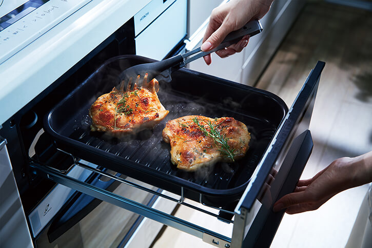 シーズヒーターの直火とプレート加熱で食材をすばやく焼き上げます。